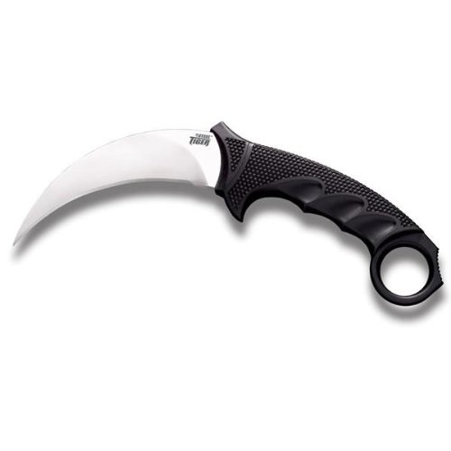 Cold Steel has always contended that the Karambit is a specialized style of knife with unique but limited uses. It is also, however, quite popular. So, in response to the many requests from our customers, and with the help of custom knife maker, Steven Likarich, we proudly introduce the Steel Tiger(R), our interpretation of this ancient Indonesian knife: It possesses all the best features of the classic Karambit and unites them with modern styling and materials, and, best of all; we've kept it very affordable: The broadly curved AUS 8A stainless blade is beautifully polished, taper ground, and vacuum heat-treated and sub zero quenched, for maximum strength, cutting power and edge retention: But it's the grip that really distinguishes it from the competition. Designed for comfort, strength and ease of use, it features a tough Grivory(R) core that encapsulates the tang, emerging as the bolster/thumbshelf and distinctive finger ring. This core is then overmolded with Kraton(R), which yields more to hand pressure than Grivory, and, in turn, creates a superb, non-slip grip: For safety, convenience and quick access, the Steel Tiger(R) comes with a sturdy Secure-Ex(R) sheath that you can lash to your gear or retain on your person via the removable boot/belt clip. Weight: 5.4 oz. Blade: 5". Thick: 5mm. Overall: 9 3/4". Handle: Kraton(R) & Grivory(R). Sheath: Secure-Ex(R). Steel: AUS 8A Stainless.
