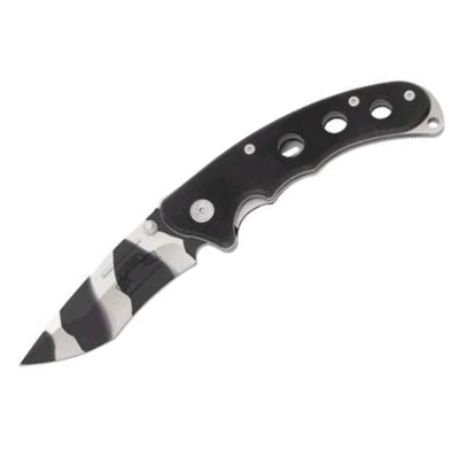 G-10 Handle, stainless steel pocket clip. 3-5/16" 440 stainless steel blade. 5" closed length. Tactical Black Titanium Camo Finish.