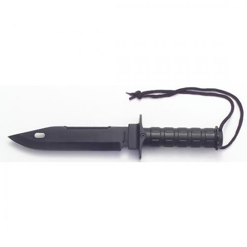 Features a 5.50 in. black stainless steel blade and a 4.50 in. black handle: Contains: 1 Black nylon sheath. Precision compass built into butt cap. Survival kit stored inside the handle.